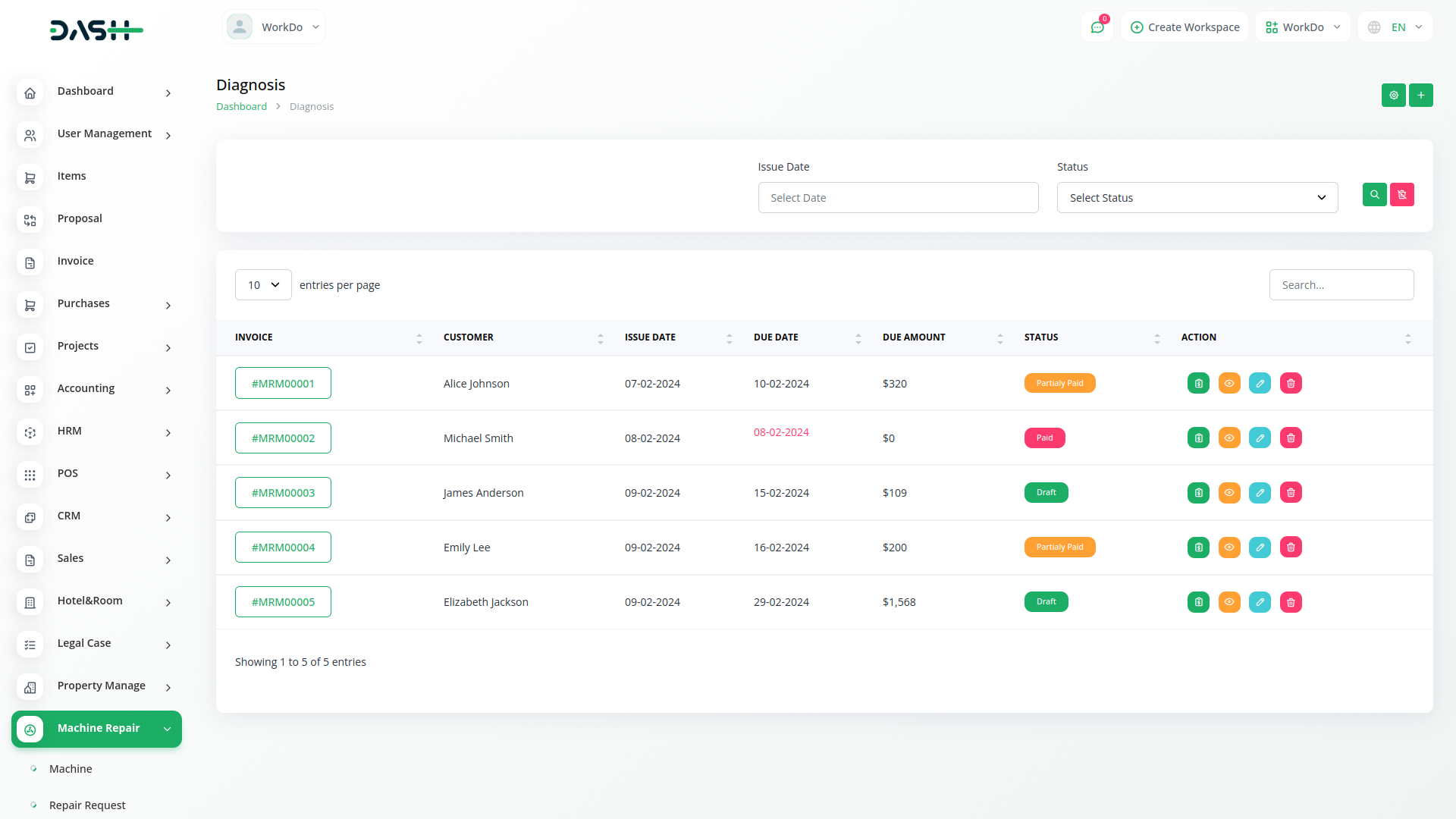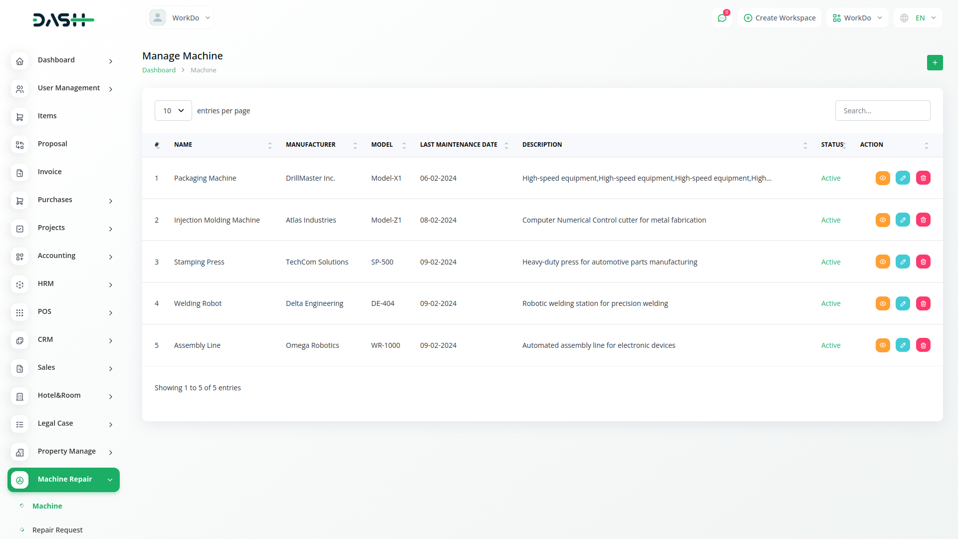 Dash SaaS revolutionizes machine repair management by offering a comprehensive solution tailored to streamline every aspect of the repair process. From optimized scheduling and transparent billing to insightful maintenance reports, Dash SaaS empowers businesses to efficiently manage machine repairs, ensuring minimal downtime and maximum productivity. With user-friendly interfaces and robust features, Dash SaaS simplifies repair request processing, defect tracking, and maintenance documentation, facilitating seamless communication and enhanced workflow efficiency.