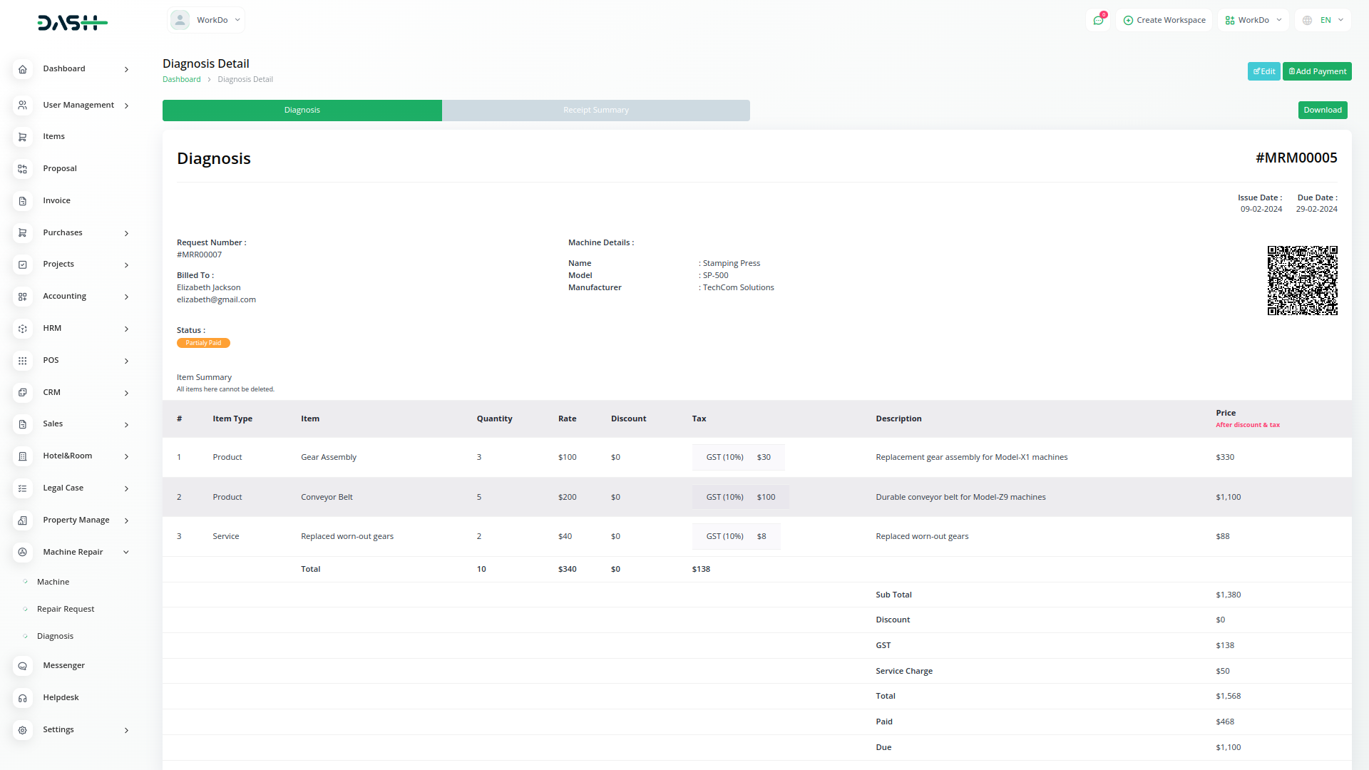 Overall, the Machine Repair Management Integration in Dash SaaS streamlines workflow processes enhances communication, improves maintenance practices, and ensures financial transparency. With this solution, businesses can optimize their repair processes for efficiency, compliance, and client satisfaction.